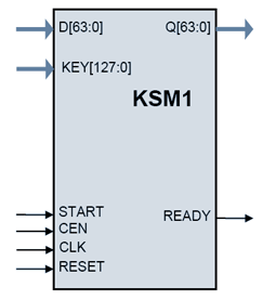The KSM1 core implements Kasumi encryption in compliance with the ETSI SAGE specification. It processes 64-bit blocks using 128-bit key. |