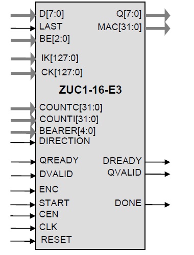 With the -E3 option, the core performs the encryption and authentication using the EEA3 and EIA3 algorithms. The input data shall be zero-padded to D/Q bus width. LAST input shall be asserted along with the last word of the input data. After calculating the MAC, the core will assert the DONE output and output the calculated MAC value onto the MAC[31:0] bus.