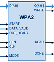 The core is designed for flow-through operation, with byte-wide input and output interfaces. CCM key and nonce material precedes the frame in the flow of data. WPA2 supports encrypt and decrypt modes